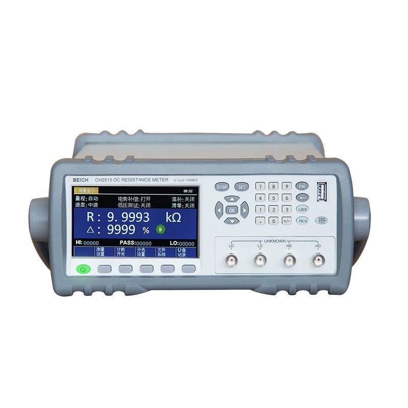2515系列直流電阻測試儀是一款高精度、寬量程電阻測試儀,采用當前主流的32bits CPU和高密度SMD貼裝工藝、24位色4.3英寸彩色液晶屏,界面直觀(guān)清爽、操作便捷;儀器具有較高的抗干擾性;量程范圍為:0.1uΩ∽110MΩ;顯示位數為五位半;測試速度可達100次/秒;測試精度可達為0.01%;儀器的溫度補償能免除環(huán)境溫度對測試工作的影響,因此最適合與測量電阻值因溫度而發(fā)生變化的被測對象;熱電勢消除功能可精確測量微弱電阻。低電壓測試功能可有效保護被測期間;儀器提供了多種接口功能,可方便的與PC進(jìn)行數據通訊和遠程控制;擁有專(zhuān)業(yè)分選功能,具有10組數據存儲,多樣分選訊響設置,還可匹配Handler接口,應用于自動(dòng)分選系統完成全自動(dòng)流水線(xiàn)測試。并可配備RS232接口(或轉換成IEEE485接口), 用于遠程控制和數據采集與分析,本儀器還配有先進(jìn)的接觸檢測功能。直觀(guān)的用戶(hù)界面與較高的耐噪音性適合于包帶機或分選機的檢測。